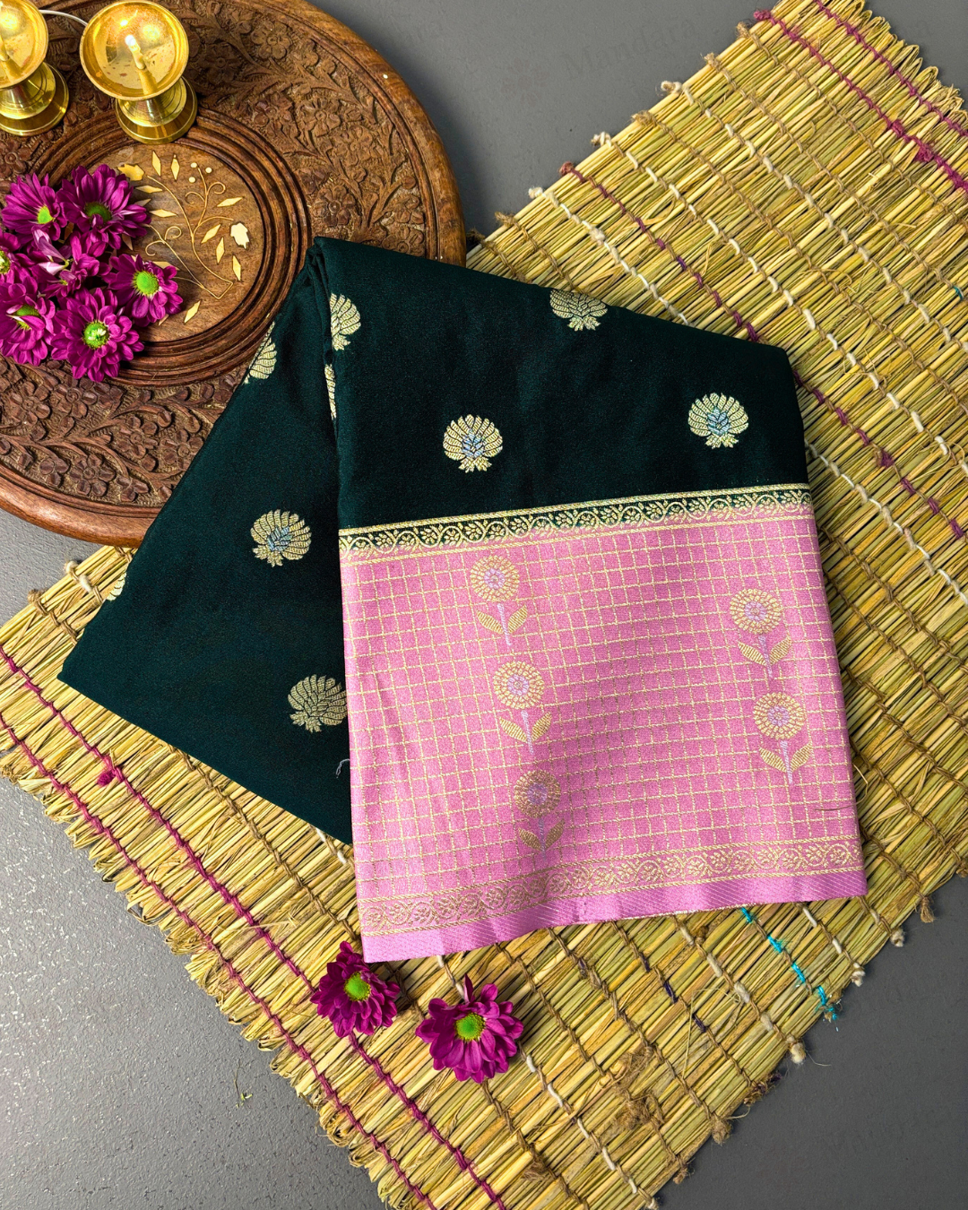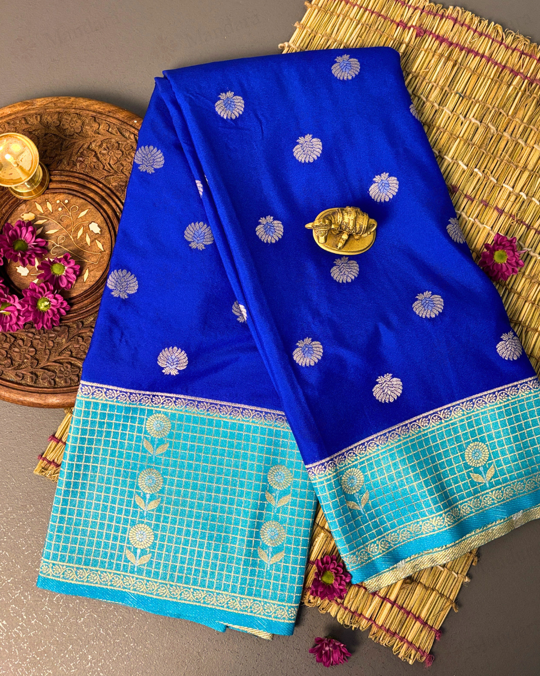 The body features delicate floral buttas woven in heavy golden zari, giving the saree a luxurious festive glow. The graceful checkered pattern adds a touch of classic Banarasi charm, while the contrasting borders make each colour variation stand out beautifully.