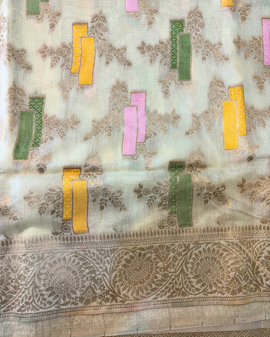 What makes it truly special are the pastel woven blocks in pink, green, and mustard, scattered tastefully across the body. These little pops of colour bring a modern charm to the classic Banarasi look, making the saree perfect for women who love a hint of playfulness in their traditional drapes.
