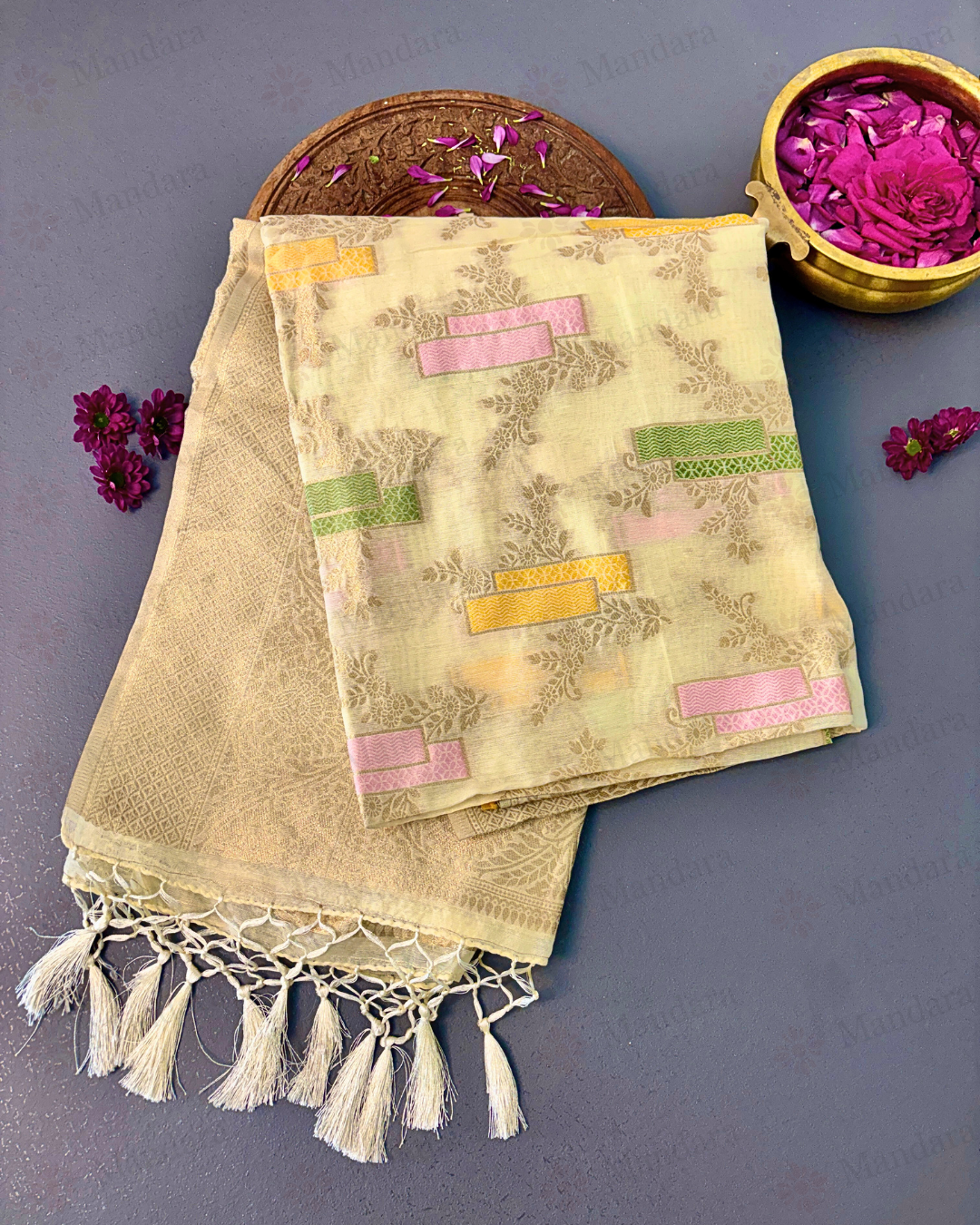 Graceful, delicate, and beautifully festive, this Banarasi Zari Silk Saree is all about soft elegance. The saree comes in a gentle gold base with intricate Banarasi floral weaving that adds a rich, traditional texture without feeling heavy.